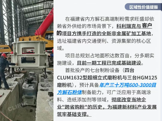 在國家大力推進新型工業(yè)、加快發(fā)展新質(zhì)生產(chǎn)力的戰(zhàn)略背景下,非金屬礦加工行業(yè)正迎來智能化、綠色化、高端化轉(zhuǎn)型的窗口期。隨著《"十四五"原材料工業(yè)發(fā)展規(guī)劃》對非金屬礦物材料產(chǎn)業(yè)高質(zhì)量發(fā)展的明確指引,以及高端制造業(yè)對超細(xì)粉體材料需求的持續(xù)攀升,行業(yè)已從傳統(tǒng)加工模式向"精細(xì)化、功能化、集群化"發(fā)展階段加速邁進。作為非金屬礦加工領(lǐng)域的重要技術(shù)參與者,科利瑞克深度參與的福建方解石制粉項目,正是這一區(qū)域性變革項目的落地,該省級示范工程——不僅填補了福建區(qū)域性自造高端方解石粉體生產(chǎn)的空白,更通過"設(shè)備集群+智能工藝+綠色布局"的創(chuàng)新模式,為非金屬礦行業(yè)轉(zhuǎn)型升級提供了可復(fù)制的解決方案。